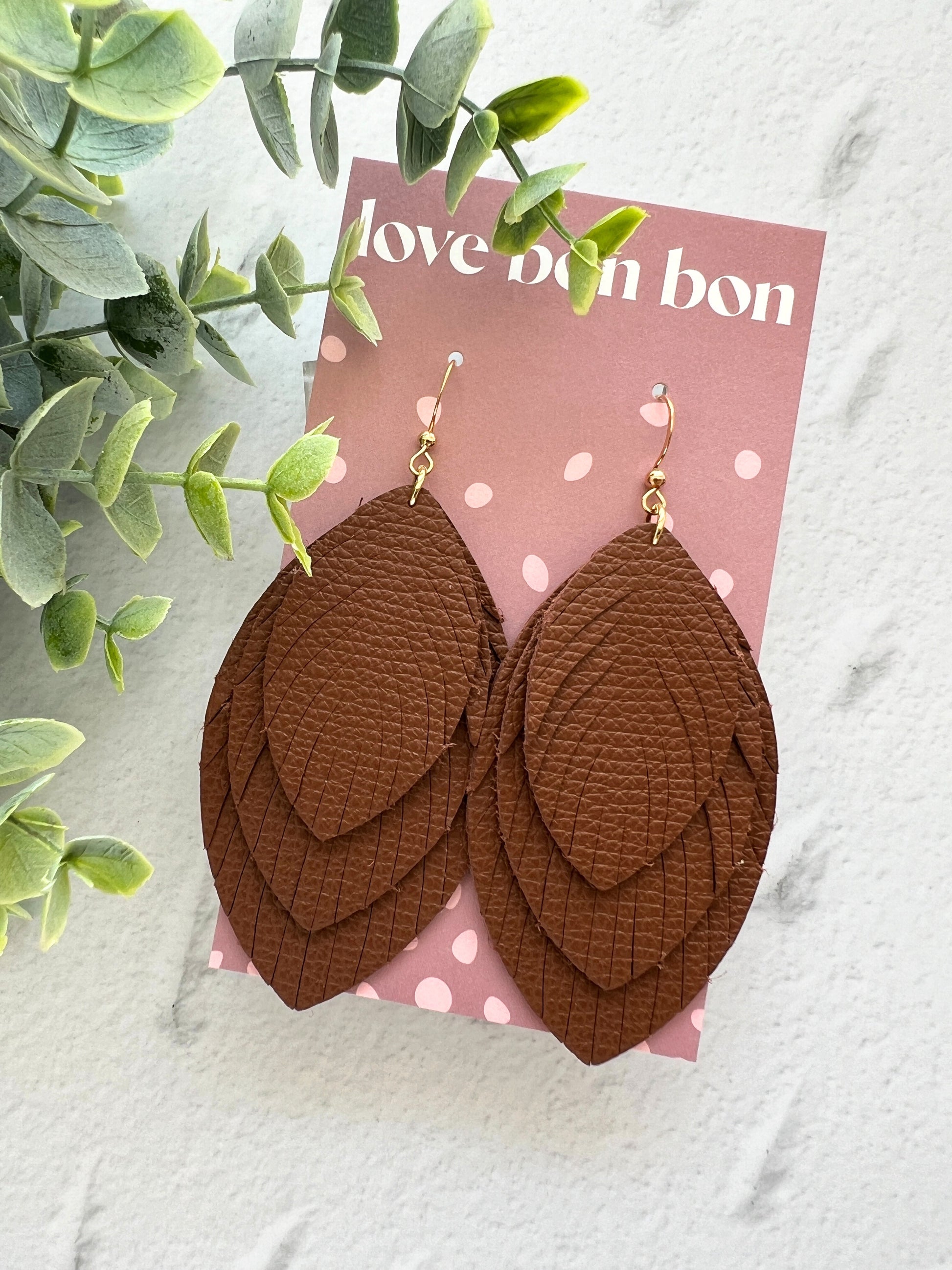 Please note that each pair of earring will differ slightly from the photo due to the leather pattern/placement and photo lighting
